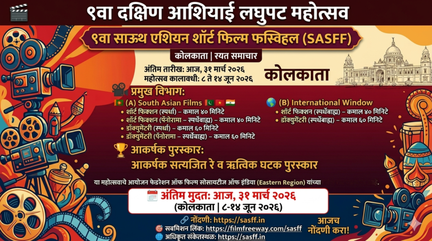 (Art) चित्रपट निर्माते आणि डॉक्युमेंटरी दिग्दर्शकांसाठी एक मोठी संधी उपलब्ध झाली असून, ९ वा साऊथ एशियन शॉर्ट फिल्म फेस्टिव्हल (SASFF) साठी नोंदणी करण्याची अंतिम तारीख आजच म्हणजे ३१ मार्च २०२६ आहे. हा प्रतिष्ठित महोत्सव ८ ते १४ जून २०२६ दरम्यान कोलकाता येथे आयोजित करण्यात येणार आहे.