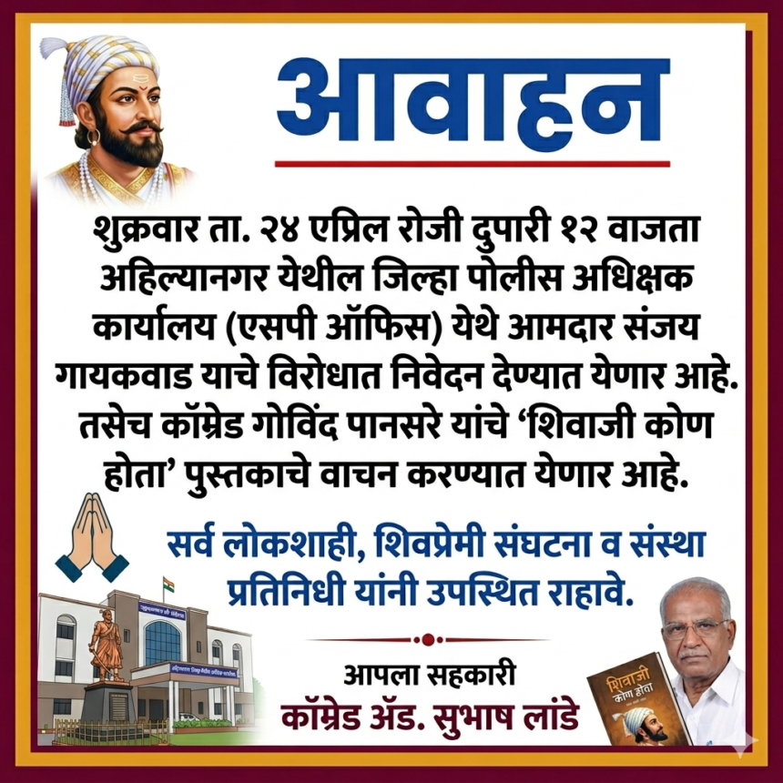 (Cultural Politics) शिवद्रोही आमदार संजय गायकवाड यांनी केलेल्या वक्तव्याचा निषेध करण्यासाठी आणि प्रबोधन करण्यासाठी आज शुक्रवारी ता.२४ एप्रिल रोजी अहिल्यानगर जिल्हा पोलिस अधिक्षक कार्यालय येथे वेगळे आंदोलन करण्यात येणार आहे. यावेळी ‘शिवाजी कोण होता’ या पुस्तकाचे जाहीर वाचन करण्यात येणार आहे. दुपारी १२ वाजता जिल्हा पोलीस अधीक्षक कार्यालयासमोर हे आंदोलन होणार आहे, अशी माहिती कॉम्रेड ॲड. सुषाष लांडे यांनी दिली.
