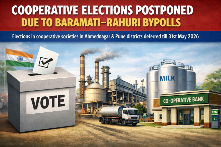 (Election) बारामती व राहुरी विधानसभा मतदारसंघात सुरू असलेल्या पोटनिवडणुकीच्या पार्श्वभूमीवर राज्य सरकारने मोठा निर्णय घेतला आहे. अहिल्यानगर आणि पुणे जिल्ह्यातील सर्व सहकारी संस्थांच्या निवडणुका आता ३१ मे २०२६ पर्यंत पुढे ढकलण्यात आल्या आहेत.