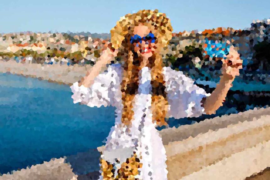 Elegant glamour magnificent woman wearing luxury white dress and straw accessories making selfie at beach front in French Riviera, traveling goals, bright sunny colors, blue ocean.
