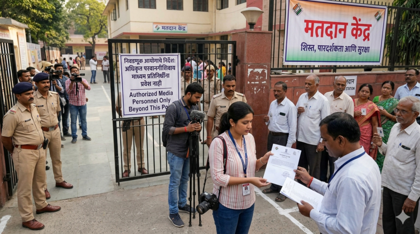 (Press) निवडणूक आयोगाच्या निर्देशानुसार, मतदान केंद्रांवरील माध्यम प्रतिनिधींचा प्रवेश Conduct of Election Rules, 1961 च्या नियम 32 नुसार मतदान केंद्राध्यक्षांच्या नियंत्रणाखाली राहणार आहे. त्यामुळे प्रत्येक पत्रकाराला नियमानुसार परवानगी घेणे बंधनकारक ठरणार आहे.