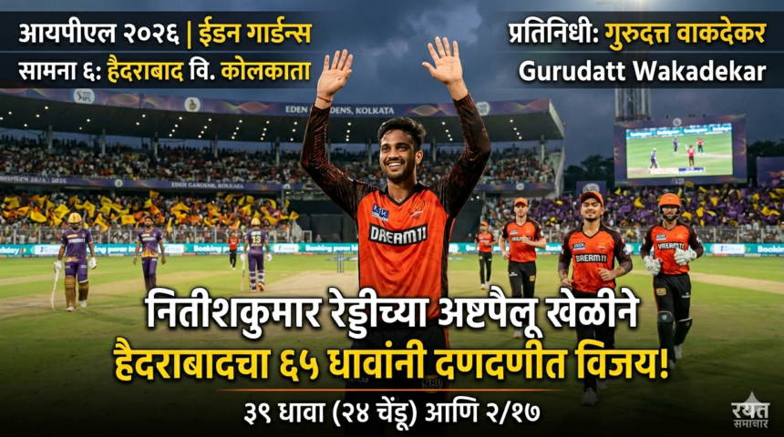 (T20) ईडन गार्डन्स, कोलकाता येथे झालेल्या इंडियन प्रीमियर लीग २०२६ च्या सहाव्या टी-२० सामन्यात सनरायझर्स हैदराबादने कोलकाता नाईट रायडर्सवर ६५ धावांनी दणदणीत विजय मिळवला. प्रथम फलंदाजी करत हैदराबादने २० षटकांत २२६/८ अशी हंगामातील सर्वोच्च धावसंख्या उभारली. प्रत्युत्तरात कोलकात्याचा डाव १६ षटकांत १६१ धावांत संपुष्टात आला. २२६ धावांचे लक्ष्य बचावणे हे या हंगामातील सर्वात मोठ्या यशस्वी बचावांपैकी एक ठरले. या विजयाचा शिल्पकार ठरला सामनावीर नितीश कुमार रेड्डी, ज्याने २४ चेंडूत ३९ धावा करत २ षटकांत १७ धावांत २ बळी घेत अष्टपैलू चमक दाखवली.